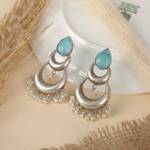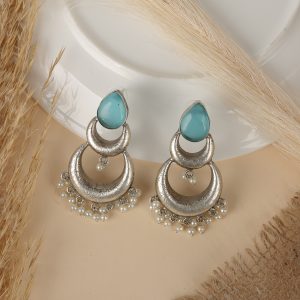 These enchanting Chaand Fancy Earrings beautifully combine the elegance of chandbali and dangler styles, creating a stunning statement piece. Crafted from high-quality brass with a radiant silver-like finish, these earrings feature a vibrant blue artificial stone at the center, adding a rich and striking touch to the design. The intricate chandbali shape is complemented by delicate white pearls at the bottom, offering a timeless, graceful movement with every step. Designed for comfort and security, the earrings come with a push-back fastening and stopper, ensuring they stay in place all day long. Perfect for special occasions, weddings, or festive events, these Chaand Fancy Earrings will effortlessly elevate your look with their luxurious and sophisticated appeal.