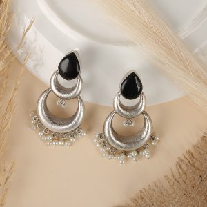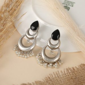These striking Chaand Black Stone Earrings offer a perfect blend of traditional elegance and modern flair. Designed with a beautiful chandbali and dangler style, these earrings are crafted from high-quality brass with a lustrous silver-like finish. The bold black artificial stone at the center exudes sophistication, while delicate white pearls at the bottom add a timeless touch of grace and movement. The intricate design is further enhanced with a secure push-back fastening and stopper, ensuring the earrings stay in place throughout the day. Ideal for special occasions, festivals, or evening events, these Chaand Black Stone Earrings will make a bold yet elegant statement, elevating any outfit with their distinctive charm.