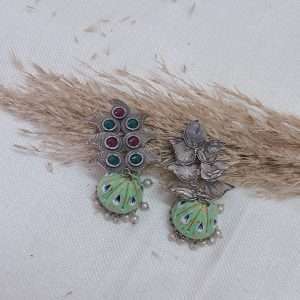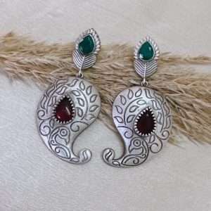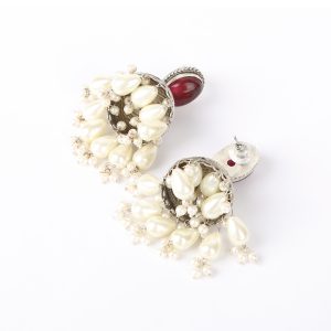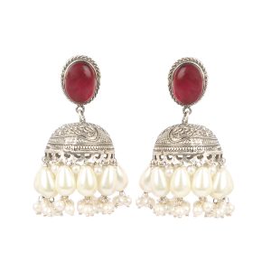 Explore the Gulmohar festive Jhumka Earrings, crafted from lightweight brass with a silver-like oxidized finish. Featuring mehroon-colored artificial stones and white pearls at the bottom, these traditional danglers add an elegant touch to any festive look. Designed with a secure push-back closure and stopper, these affordable ethnic earrings are perfect for women looking for the best oxidized earrings. Stylish, lightweight, and versatile, these fancy earrings are ideal for both casual and special occasions, making them a must-have in your jewelry collection.