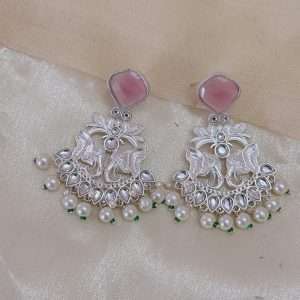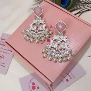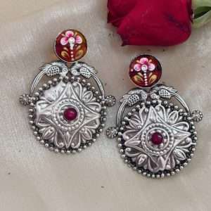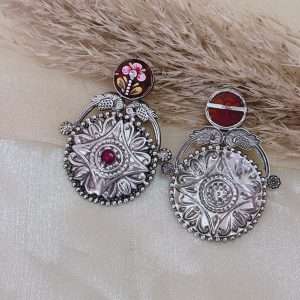 Explore the Gulmohar festive Jhumka Earrings, crafted from lightweight brass with a silver-like oxidized finish. Featuring mehroon-colored artificial stones and white pearls at the bottom, these traditional danglers add an elegant touch to any festive look. Designed with a secure push-back closure and stopper, these affordable ethnic earrings are perfect for women looking for the best oxidized earrings. Stylish, lightweight, and versatile, these fancy earrings are ideal for both casual and special occasions, making them a must-have in your jewelry collection.