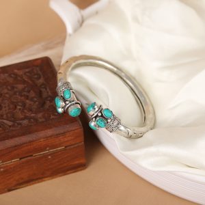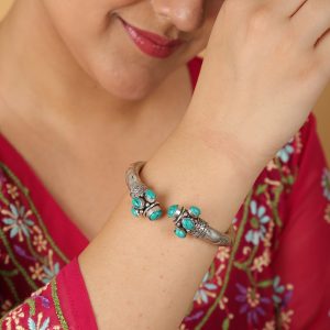 Discover the jini Bracelet – a stunning adjustable kada with a silver-like finish, crafted from brass and featuring a Turquoise artificial gemstone. This oxidized vintage bracelet is the perfect festive accessory, offering an affordable and lightweight design. Ideal for women, it adds a touch of elegance to any occasion with its beautiful hand-crafted style