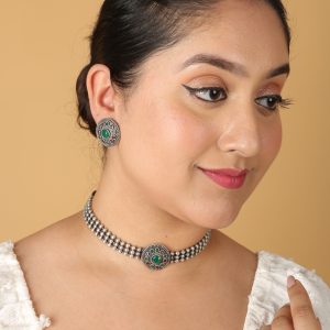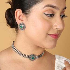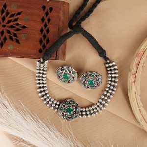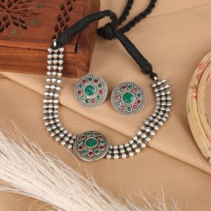 Discover the Mirraw Necklace, an elegant oxidized jewellery set crafted from antique silver and brass. Featuring a unique adjustable neckpiece with matching earrings, vibrant ruby and dark green artificial gemstones, this lightweight oxidized necklace for girls offers a perfect blend of tradition and style. A stunning oxidized jewellery choker and neckpiece, ideal for any occasion.