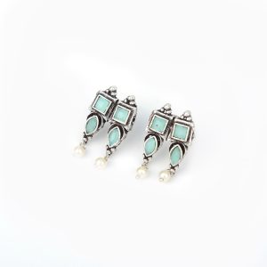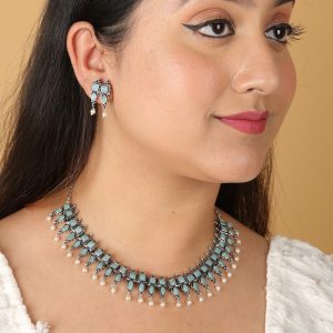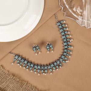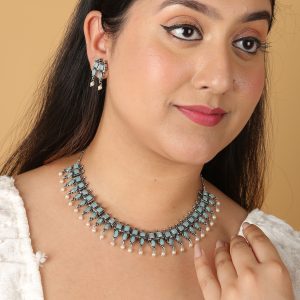 Shop the Tani designer Necklace set, featuring an antique silver and brass design with mint artificial gemstones and a white pearl accent at the bottom. This adjustable choker necklace includes matching earrings, offering an affordable, lightweight oxidized jewellery set for girls. Perfect for any occasion, it’s the ideal antique necklace and earrings set.